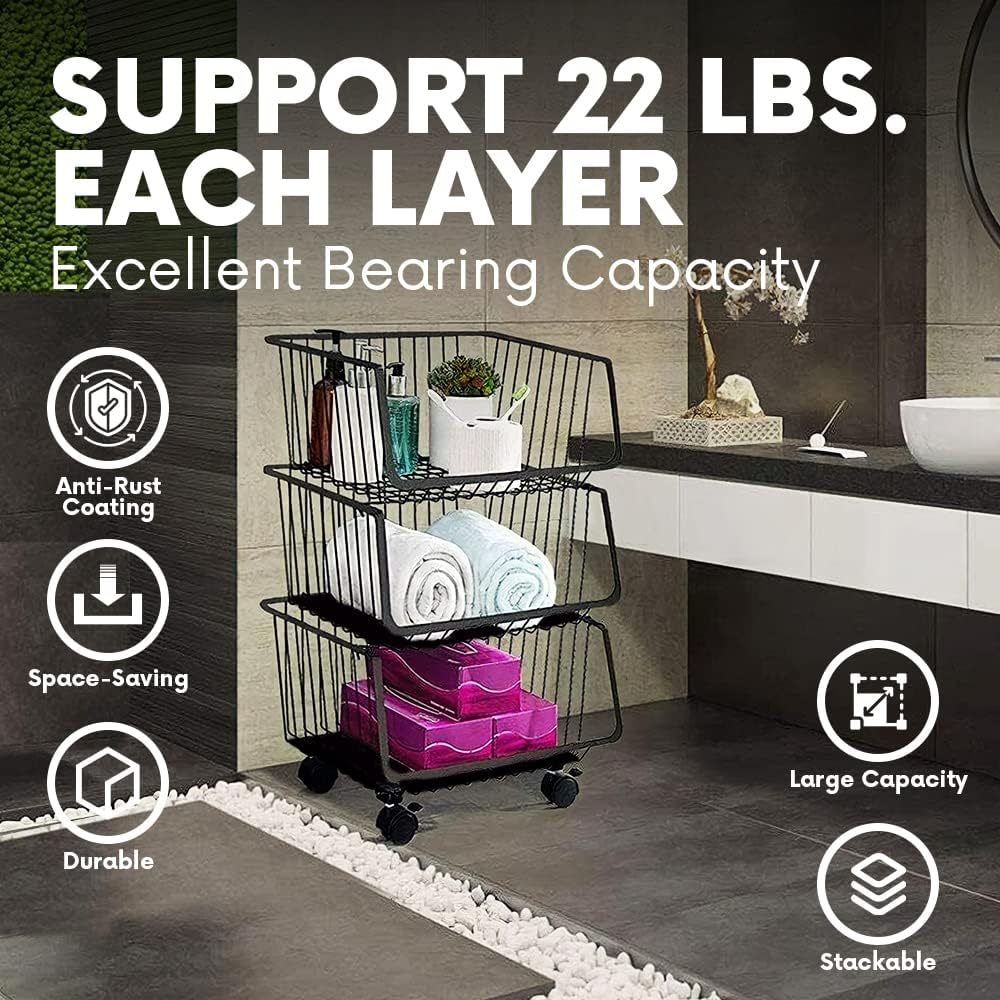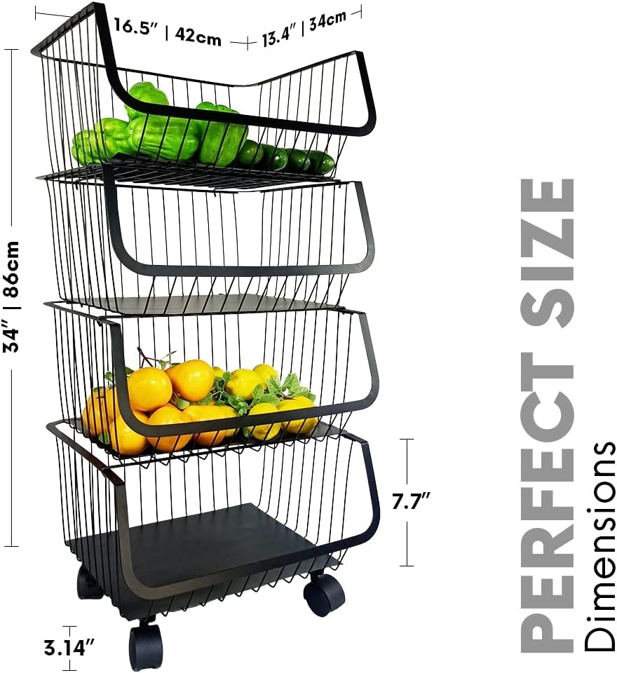 4-Tier Utility Rolling Cart - Metal Black Basket, Storage Organizer for Pantry,