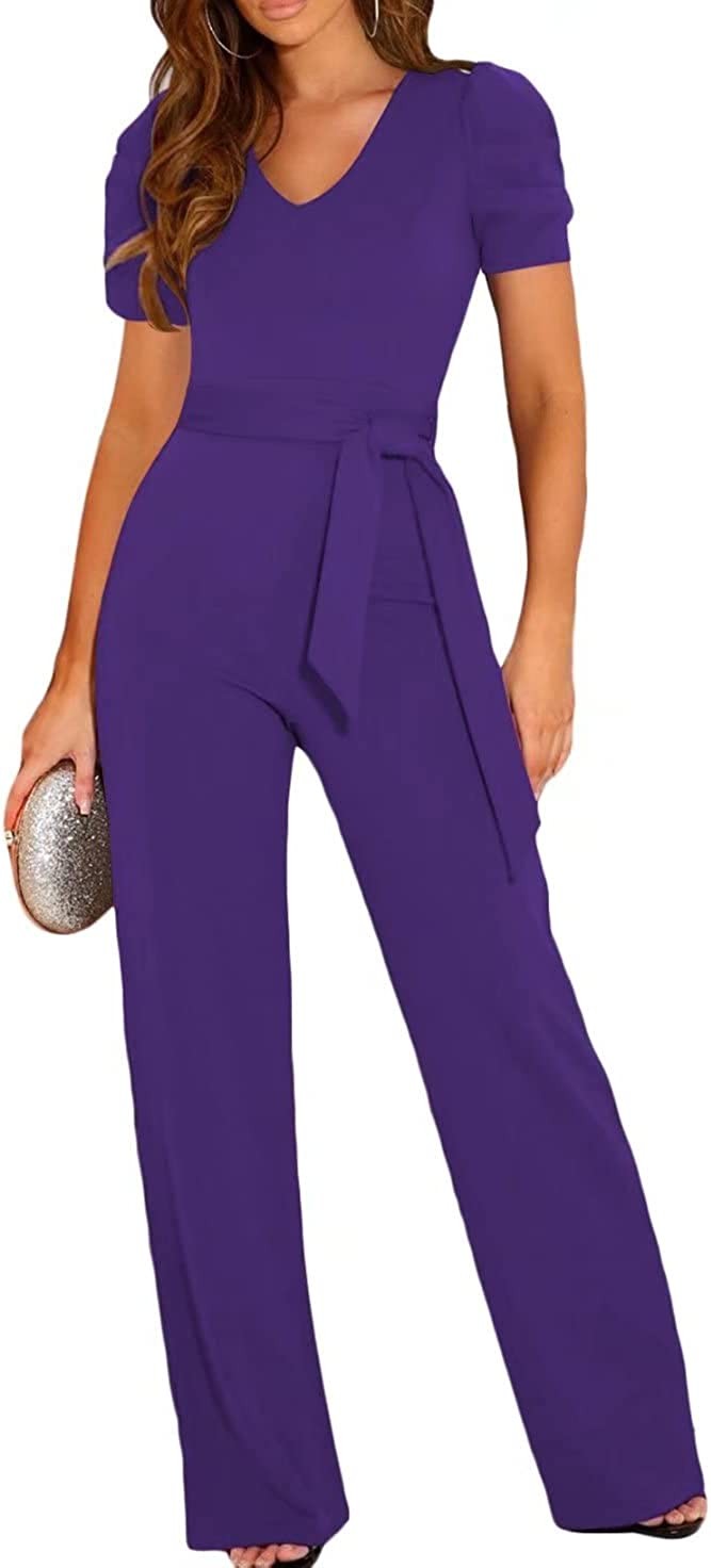 BLENCOT Womens Jumpsuit Short Sleeve Casual v Neck Belted Wide Leg Formal Romper