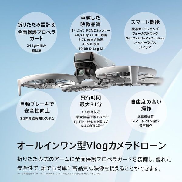 | 付属品 | DJI Flip インテリジェント フライトバッテリー*1, DJI Flip ジンバル プロテクター*1, DJI Flip*1, DJI Flipスペアプロペラ(1組)(ねじ同梱) *1, DJI RC-N3 RCケーブル(Lightningコネクター)*1, DJI RC-N3 RCケーブル(USB-Cコネクター)*1, DJI RC-N3*1, Type-C - Type-C PD規格対応ケーブル*1, スクリュードライバー |