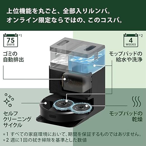 ルンバ(Roomba)Plus 405 Combo ロボット + AutoWash 充電ステーション (ロボット掃除機) iRobot【水拭き/両用/多機能充電ステーション搭載/自動ゴミ収集/モップの自動洗浄・乾燥機能付き/パワーリフト吸引/スマートスクラブ対応/マッピング/アプリ操作/GRAILED購入時12ヶ月保証/G185060】ブラック