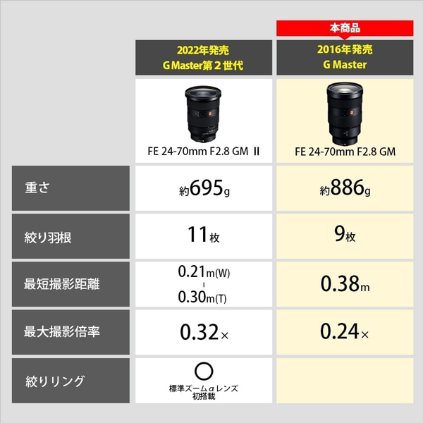 レンズタイプ‎標準ズームレンズ(SEL2470GM) - 24-70mmの焦点距離範囲、光学ズーム、デジタル式、センサーシフト式の画像安定化機能を備えた高品質なズームレンズ